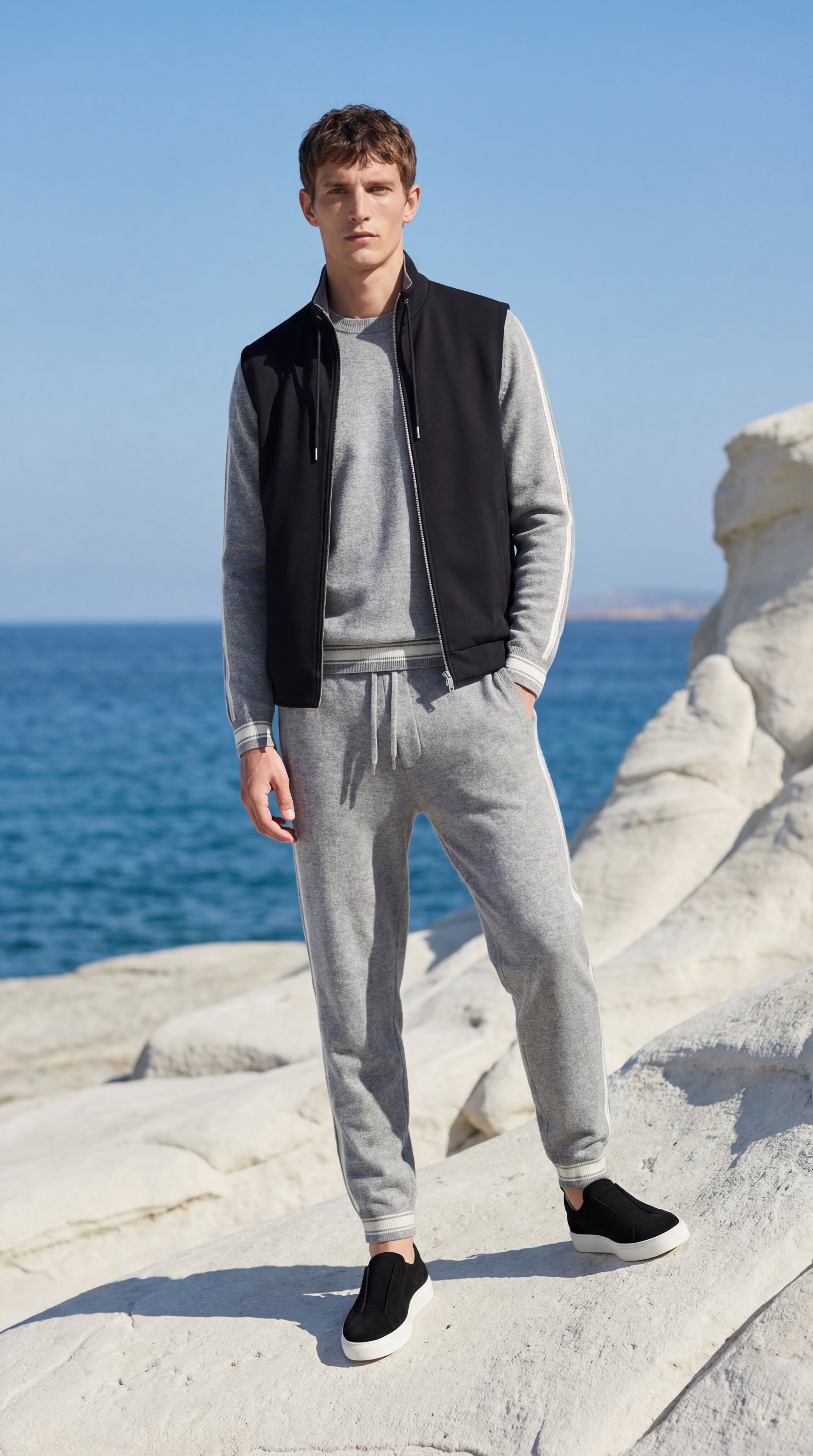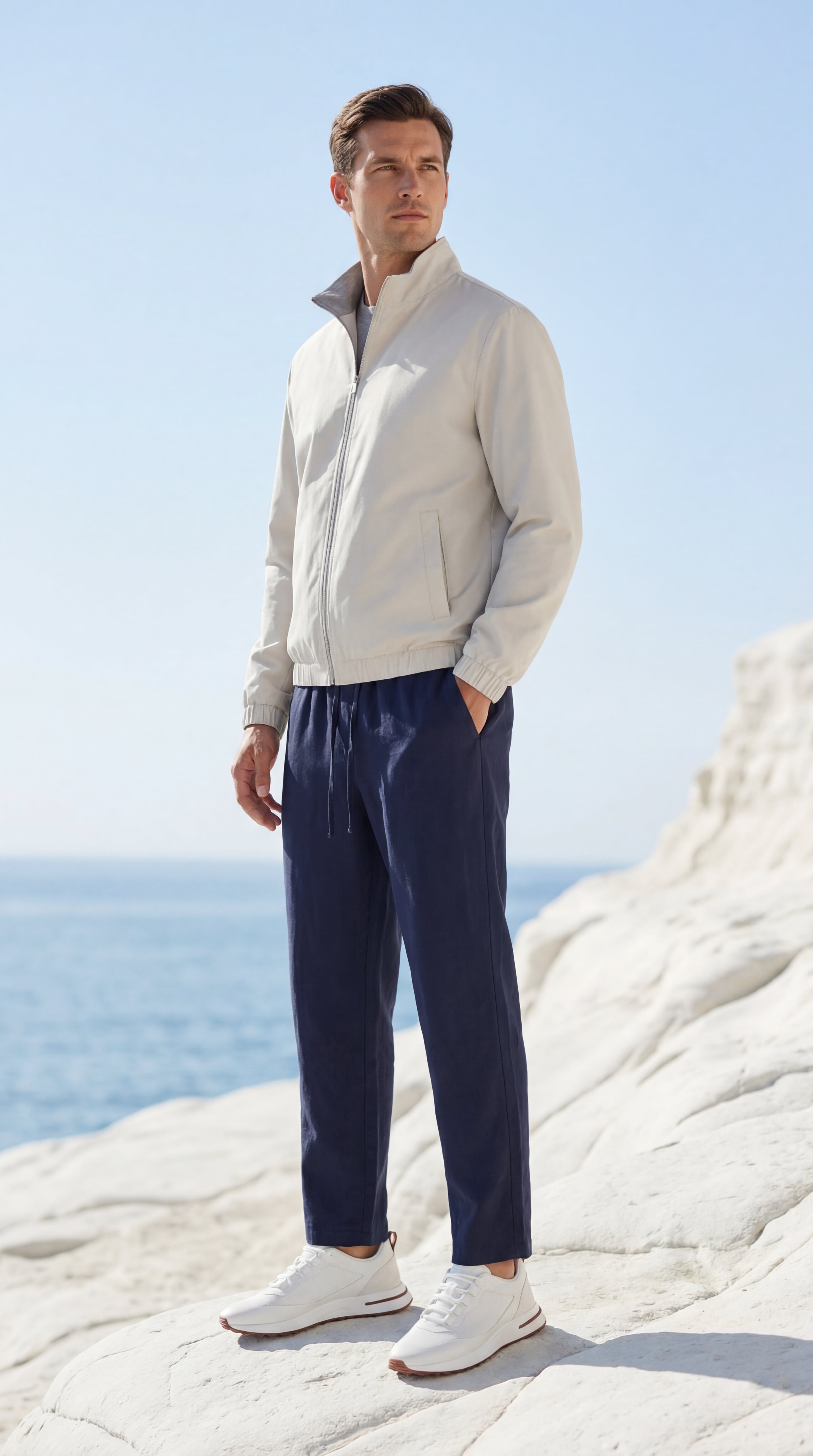 A refined reversible jacket defined by clean lines and controlled structure. The exterior is crafted from smooth premium polyester with a calm matte finish, while the interior reveals a soft wool blend lining that adds comfort and depth. Metal hardware and discreet magnetic pocket closures are integrated with precision, maintaining a balanced silhouette and a composed, contemporary presence.