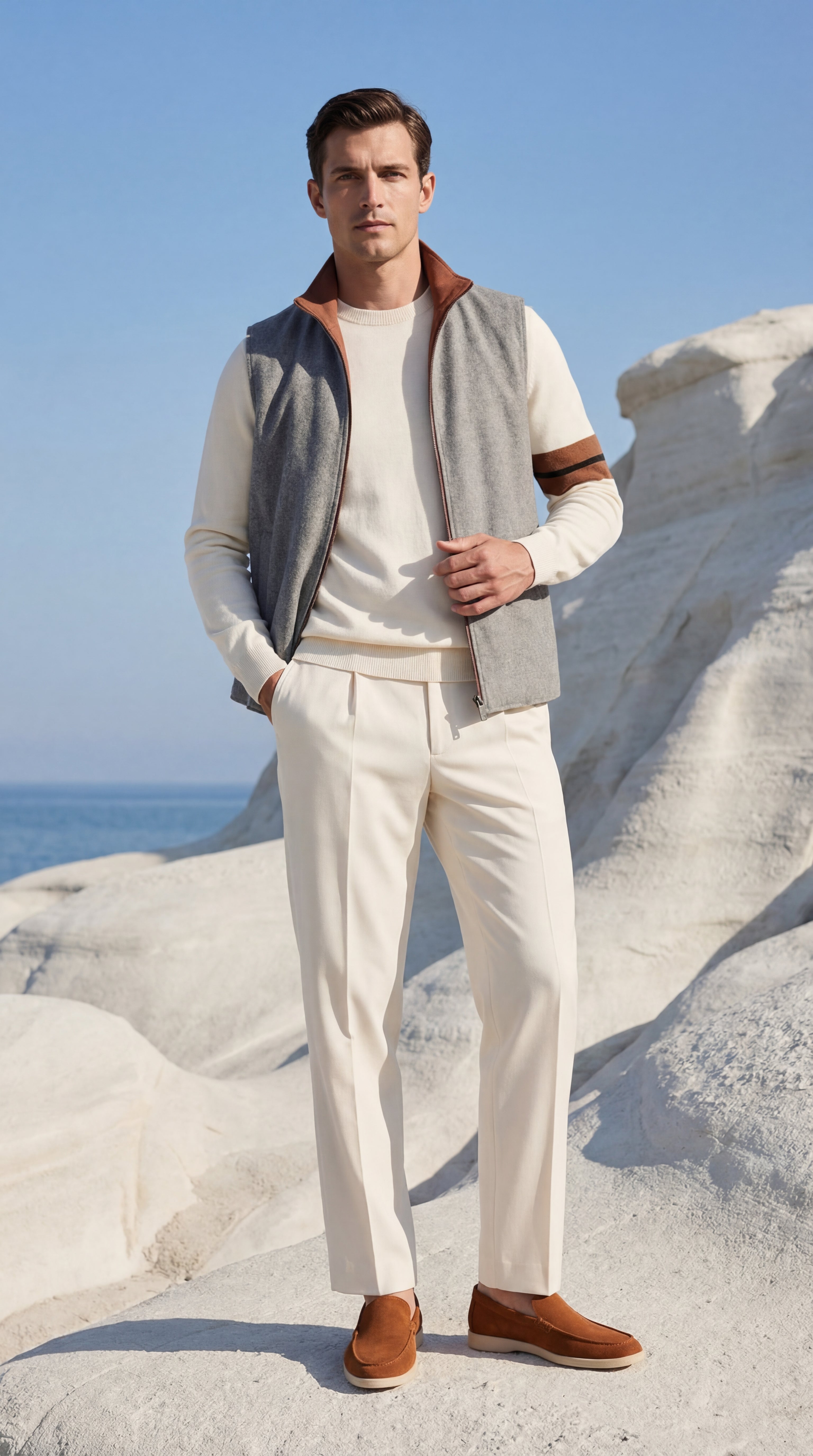 A continuous tone carried across both jacket and vest, for a unified composition.